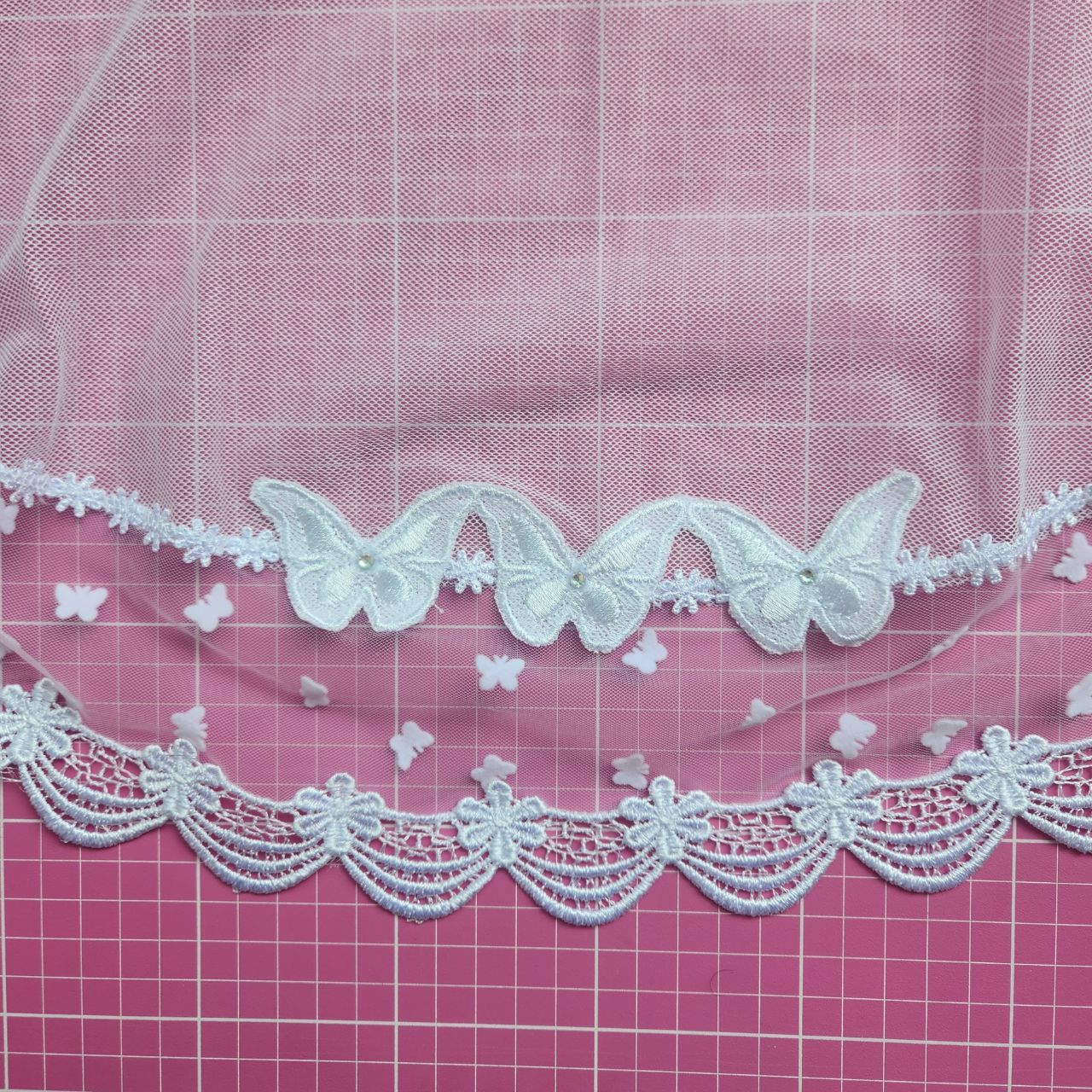 Confeccionado Tule Poá (100 poliéster) e Renda Guipir (100% poliéster).