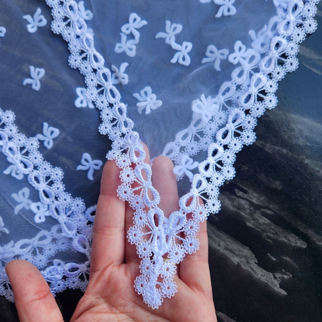 Confeccionado Tule Poá (100 poliéster) e Renda Guipir (100% poliéster).