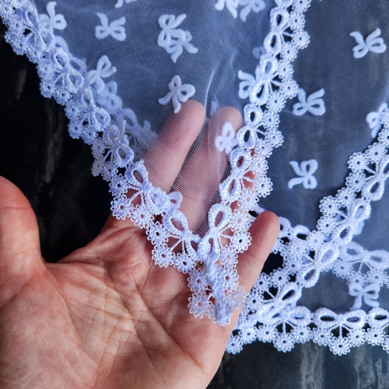Dimensão: Aprox. 80 cm x 30 cm (podendo variar conforme a largura da renda)
