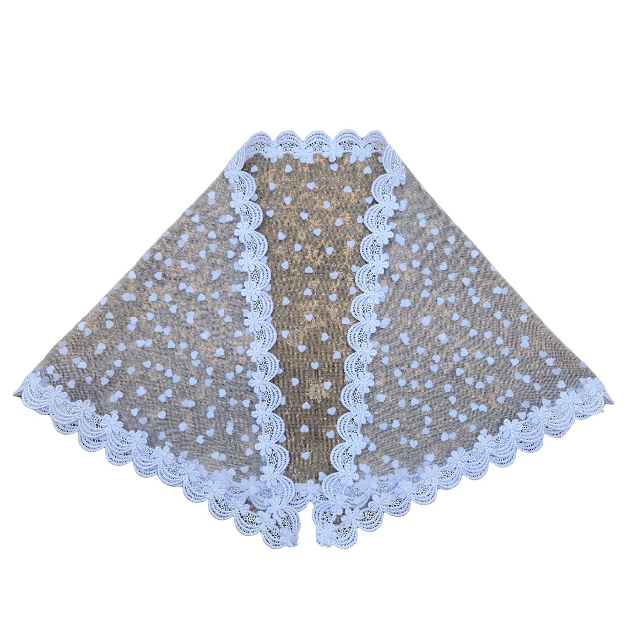Confeccionado Tule Poá (100 poliéster) e Renda Guipir (100% poliéster).
