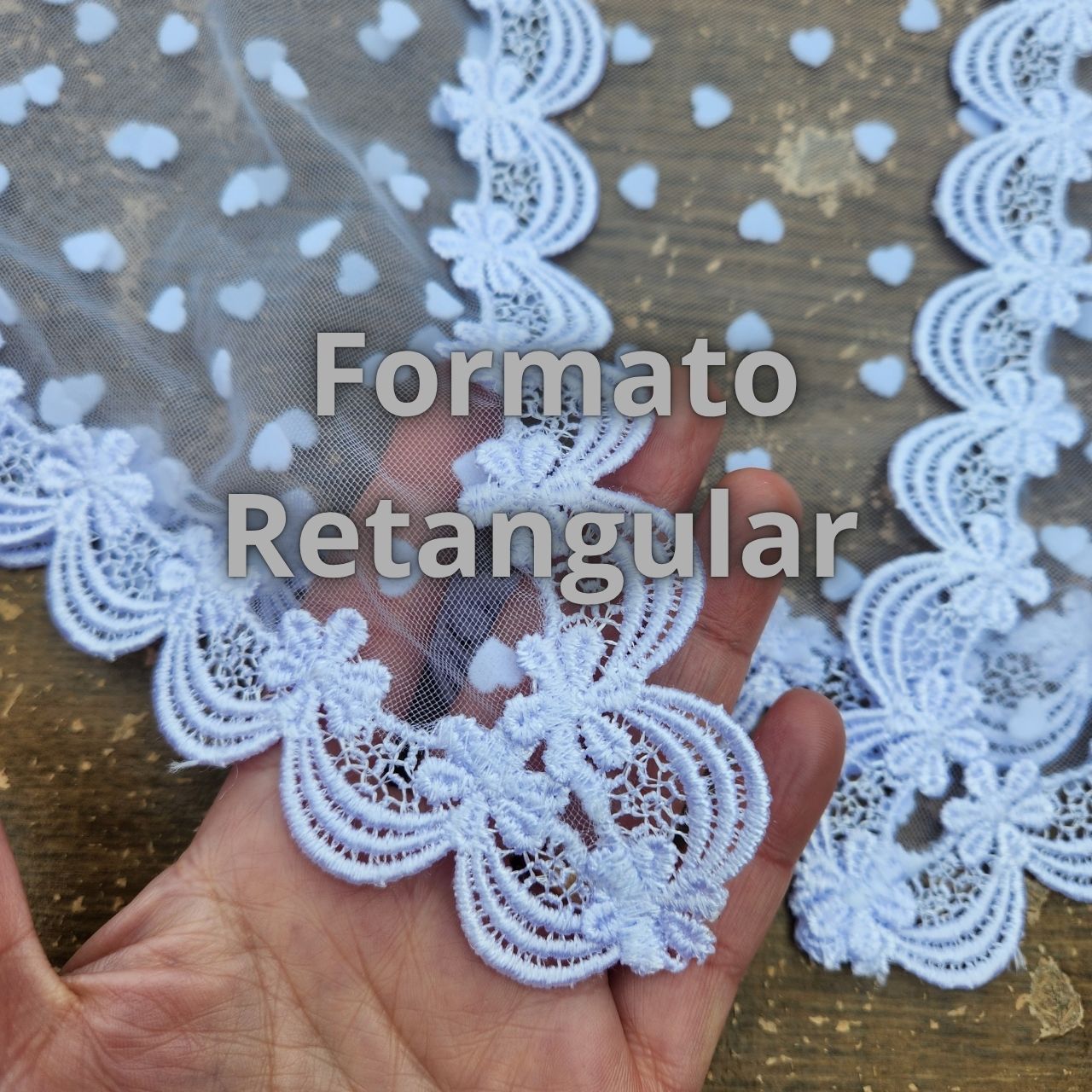 RETANGULAR = Ou véu Quadrado, é o formato mais tradicional. Ele é um retângulo com 4 bicos.