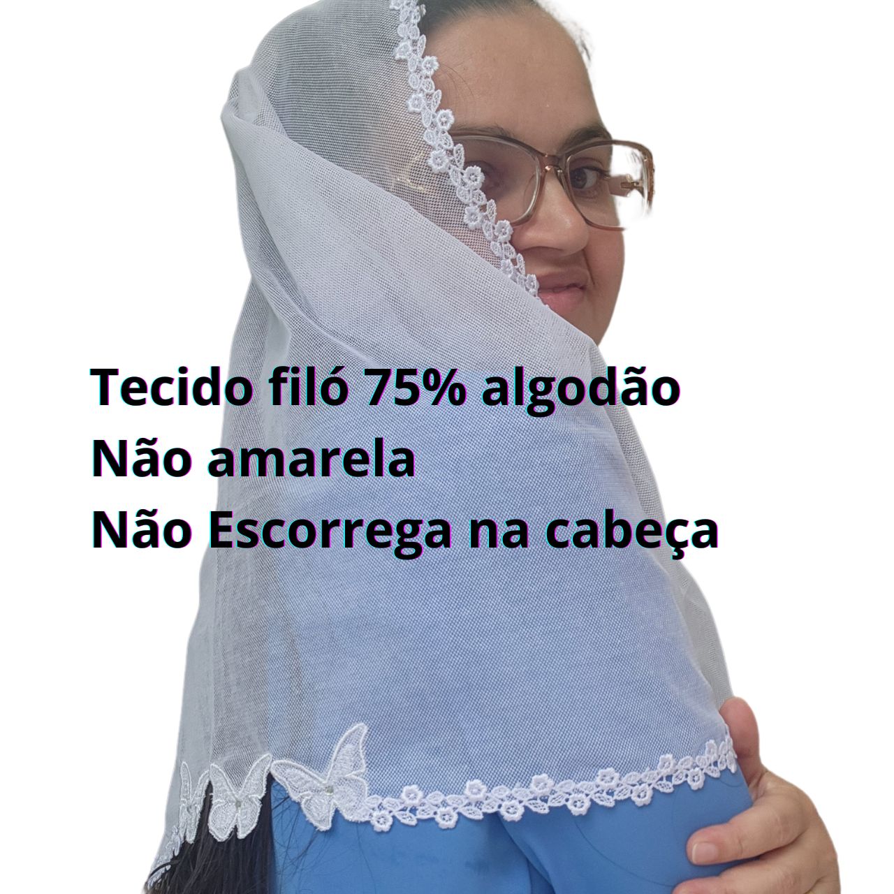 Confeccionado com Filó Verona (75% algodão e 25% poliéster) e Renda Guipir (100% poliéster).