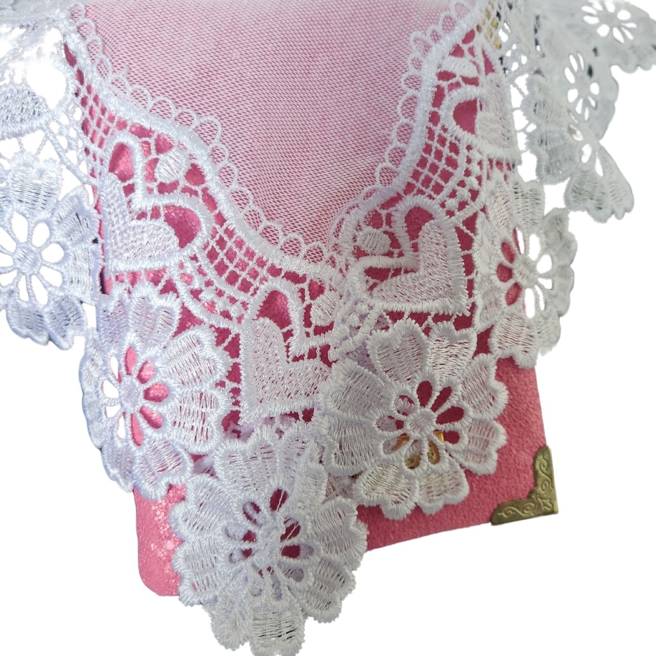 Confeccionado com Filó Verona (75% algodão e 25% poliéster) e Renda Guipir (100% poliéster).
