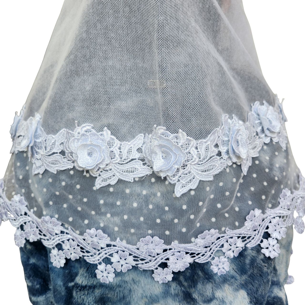 Confeccionado Tule Verona 75% Algodão, Renda Guipir (100% poliéster) e Tule Poá (100% poliéster).