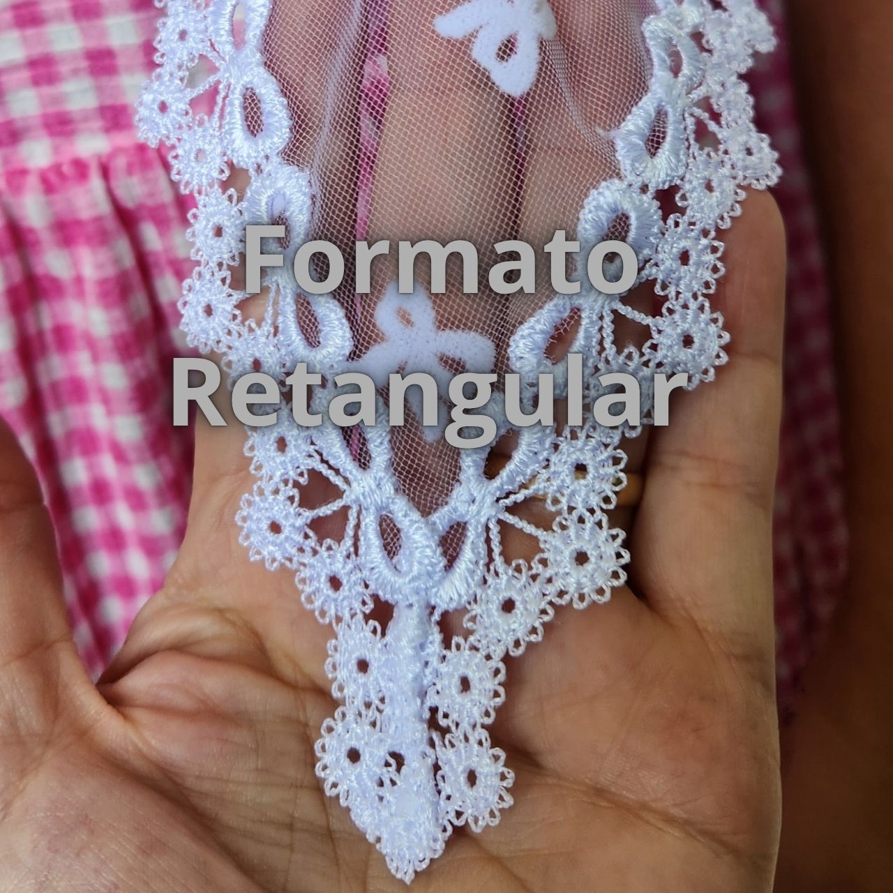 RETANGULAR = Ou véu Quadrado, é o formato mais tradicional. Ele é um retângulo com 4 bicos.