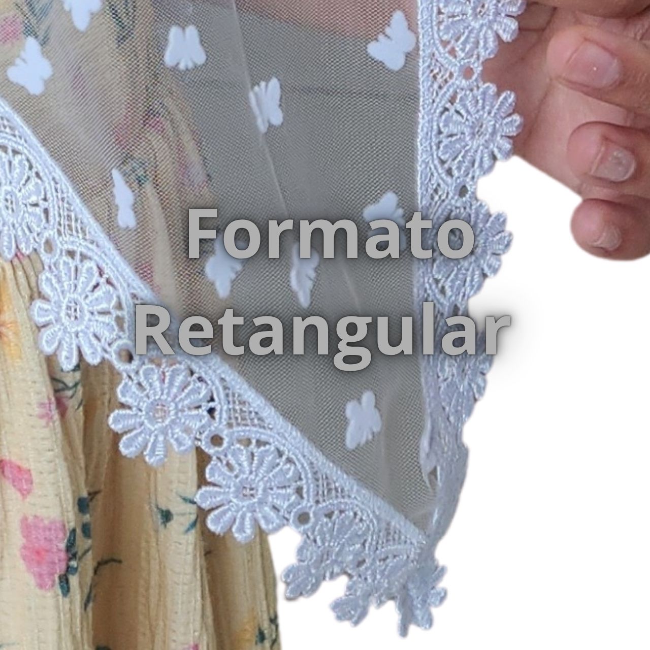 RETANGULAR = Ou véu Quadrado, é o formato mais tradicional. Ele é um retângulo com 4 bicos.